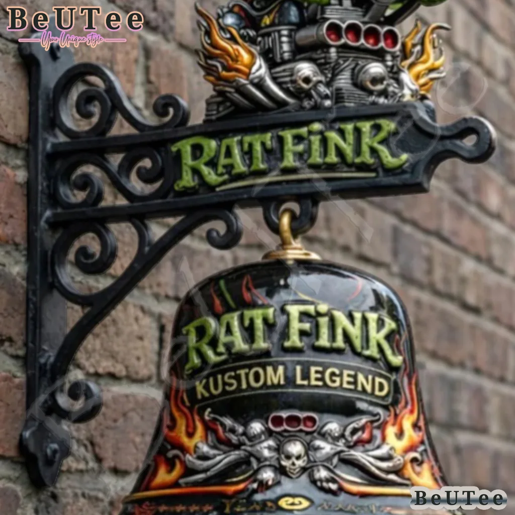 Designed to turn heads, this masterpiece features a sturdy, black scrollwork bracket that supports a wild, 3D green Rat Fink figure. He’s sporting his signature bulging eyes, sharp teeth, and a red vest, maniacally gripping the wheel of a silver engine block complete with glowing red intakes and fiery orange exhausts. Right below this iconic anti-hero, the “RAT FINK” logo is spelled out in slime-green, raised lettering on a textured black crossbar, proudly displaying the brand’s name.