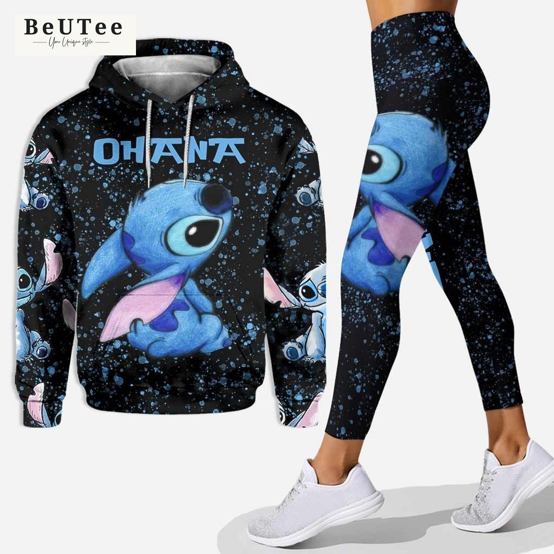 One of the standout features of this set is the endearing and iconic “Ohana” design. The front of the hoodie features a playful graphic of Stitch, surrounded by the word “Ohana,” which means “family” in Hawaiian. The design captures the heartwarming message of family and the importance of unity, just as Stitch learns throughout his journey. The leggings complement the hoodie with a solid black color, allowing the vibrant design to truly stand out. This ensemble is the perfect way to showcase your love for the beloved Disney character and embrace the spirit of family.